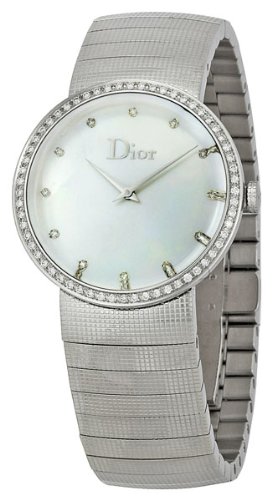 Stainless steel case with a stainless steel bracelet. Fixed stainless steel bezel set with diamonds. Mother of pearl dial with silver-tone hands and diamond hour markers. Quartz movement. Scratch resistant sapphire crystal. Solid case back. Case diameter: 34.5 mm. Deployment clasp. Water resistant at 30 meters/ 100 feet. Functions: hours, minutes. Christian Dior Baby D Diamond Ladies Watch CD042111M002.